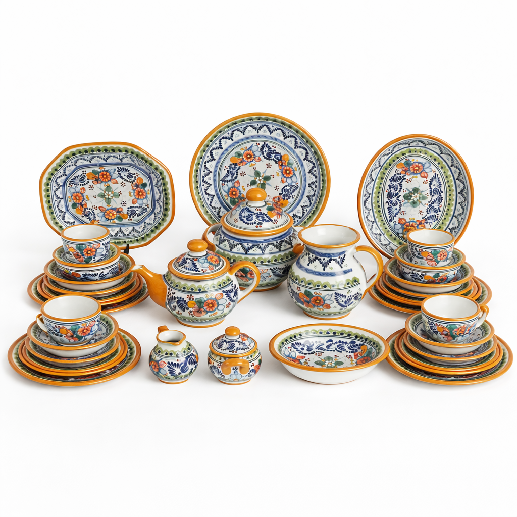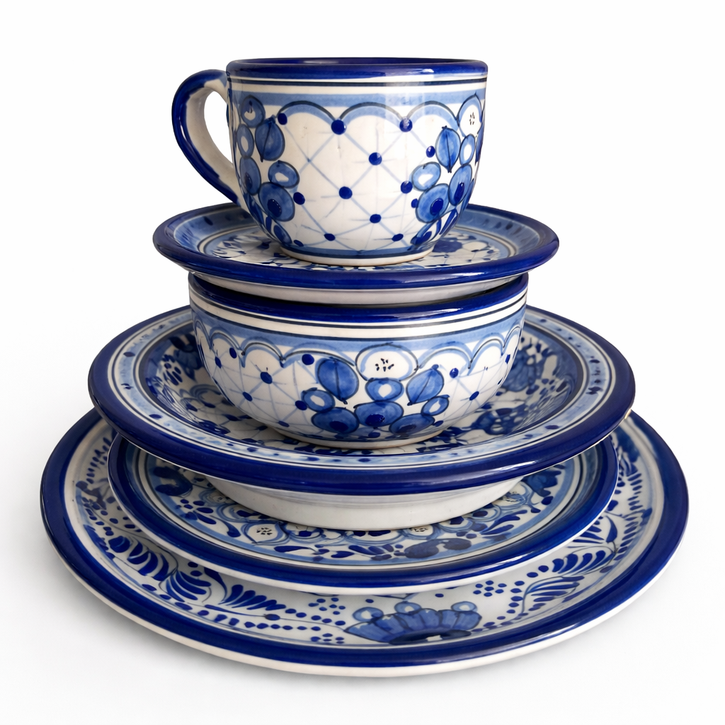 La vajilla de Talavera completa para 4 personas (37 piezas) es un conjunto artesanal elaborado y pintado a mano por artesanos mexicanos, utilizando técnicas tradicionales de la auténtica Talavera poblana. Este juego ofrece un equilibrio perfecto entre funcionalidad, elegancia y tradición, ideal tanto para el uso diario como para ocasiones especiales.