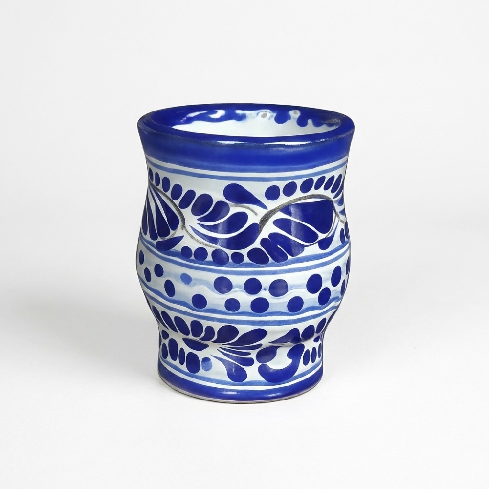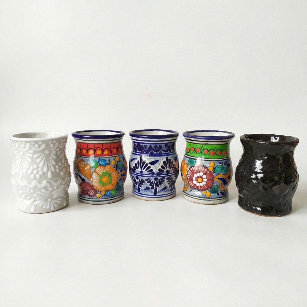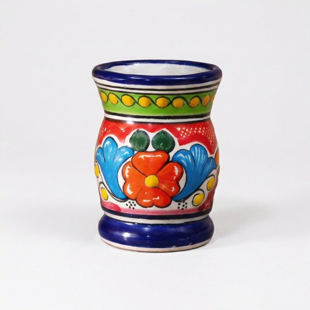 El vaso de Talavera artesanal para mate es una pieza elaborada y pintada completamente a mano por artesanos mexicanos, siguiendo las técnicas tradicionales de la auténtica Talavera poblana. Su forma ergonómica, base estable y borde ligeramente abierto lo hacen ideal para preparar y disfrutar mate, así como otras bebidas calientes o frías.